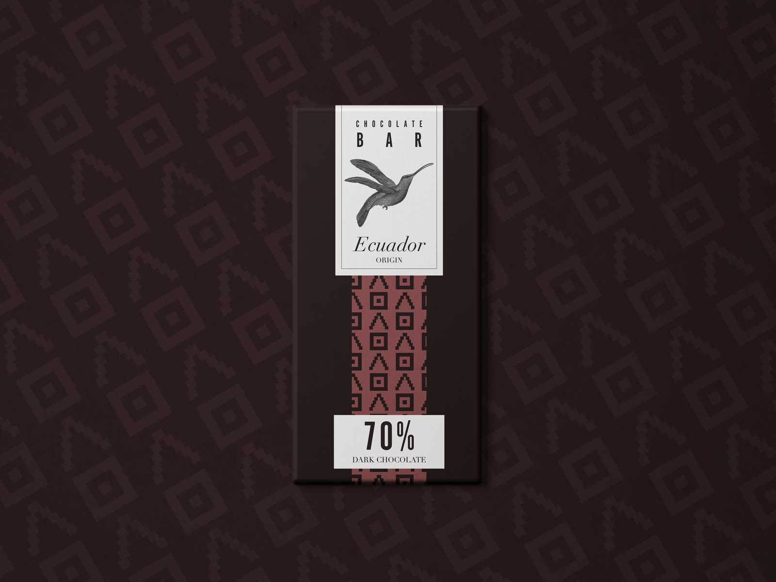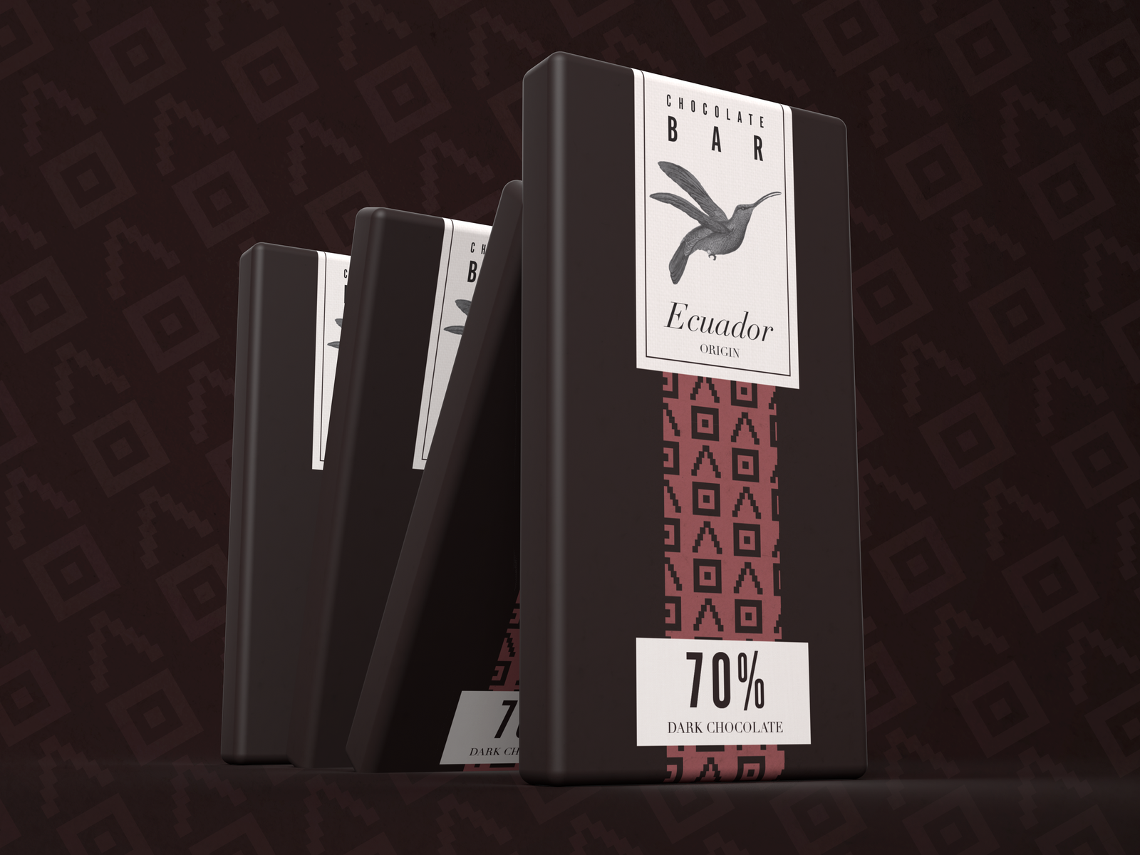 A premium chocolate packaging concept inspired by Ecuadorian heritage and minimalist elegance. The design balances tradition and modernity, incorporating geometric motifs referencing indigenous patterns and a delicate hummingbird illustration symbolizing the natural origins of the cocoa.