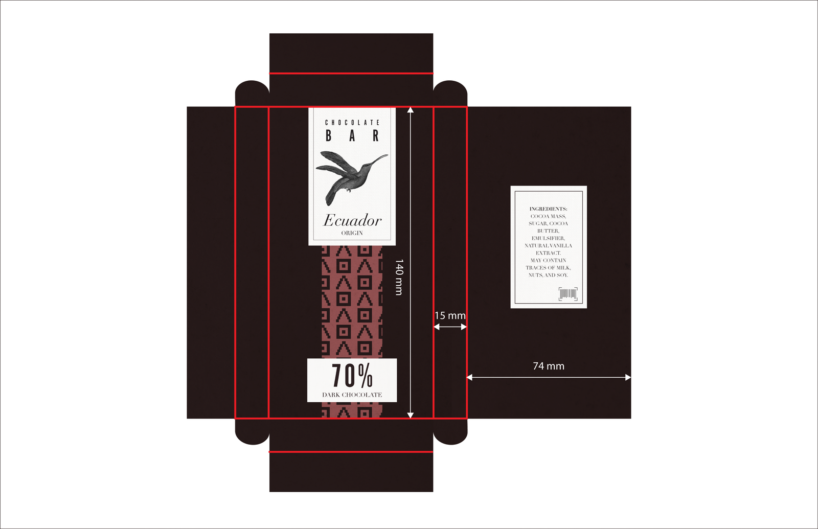This project includes a custom packaging dieline, carefully selected typography, and a rich color palette that enhances the luxurious feel of dark chocolate. For visualization, I created a 3D mockup in Adobe Dimension, complemented by an additional single-bar mockup sourced online.